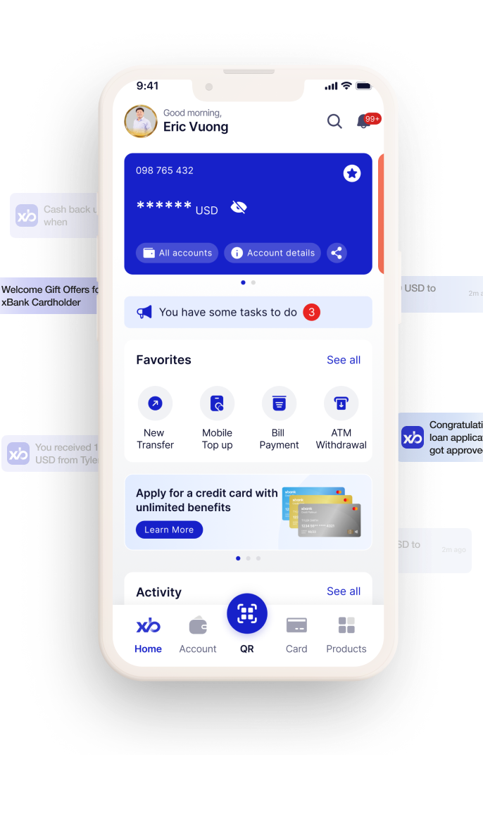 Mở tài khoản dễ dàng chỉ trong 1 phút để trải nghiệm các tính năng mới nhất và dịch vụ ngân hàng an toàn hơn cùng xBank Mobile.